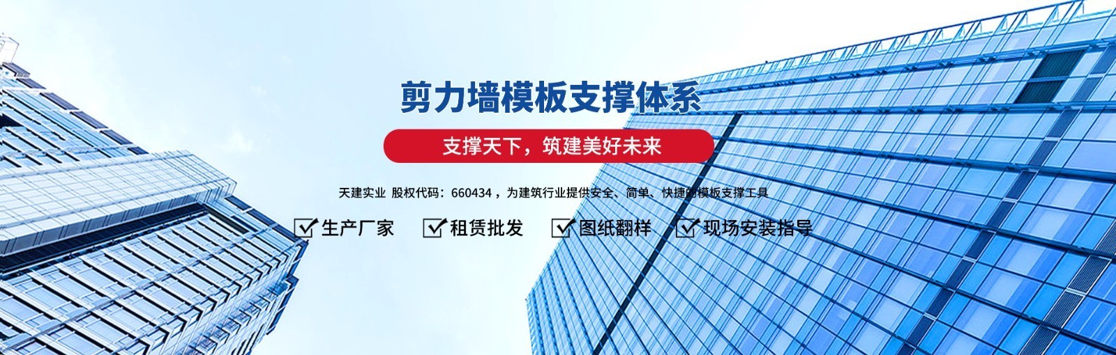 河北天建鋼結(jié)構(gòu)股份有限公司(簡稱:天建實業(yè))成立于2010年,注冊資本5500萬元,2017年掛牌,股權(quán)代碼660434,是一家集鋼支撐體系研發(fā)、生產(chǎn)、銷售、租賃、售后服務(wù)于一體科技創(chuàng)新企業(yè),地址位于河北省秦皇島市昌黎縣,致力為客戶提供安全、簡單、快捷的模板支撐工具。公司制造生產(chǎn)的鋼背楞系列產(chǎn)品,被應(yīng)用于商用建筑、高層住宅、人防、支擋、路橋、管廊等結(jié)構(gòu),適用多種模板加固工程,如木模、鋁模、鋼模、塑料模等,同時為國內(nèi)二百三十家建筑商、開發(fā)商、鋁模廠提供良好的產(chǎn)品和服務(wù),是建設(shè)服務(wù)領(lǐng)域美好品質(zhì)供應(yīng)商...